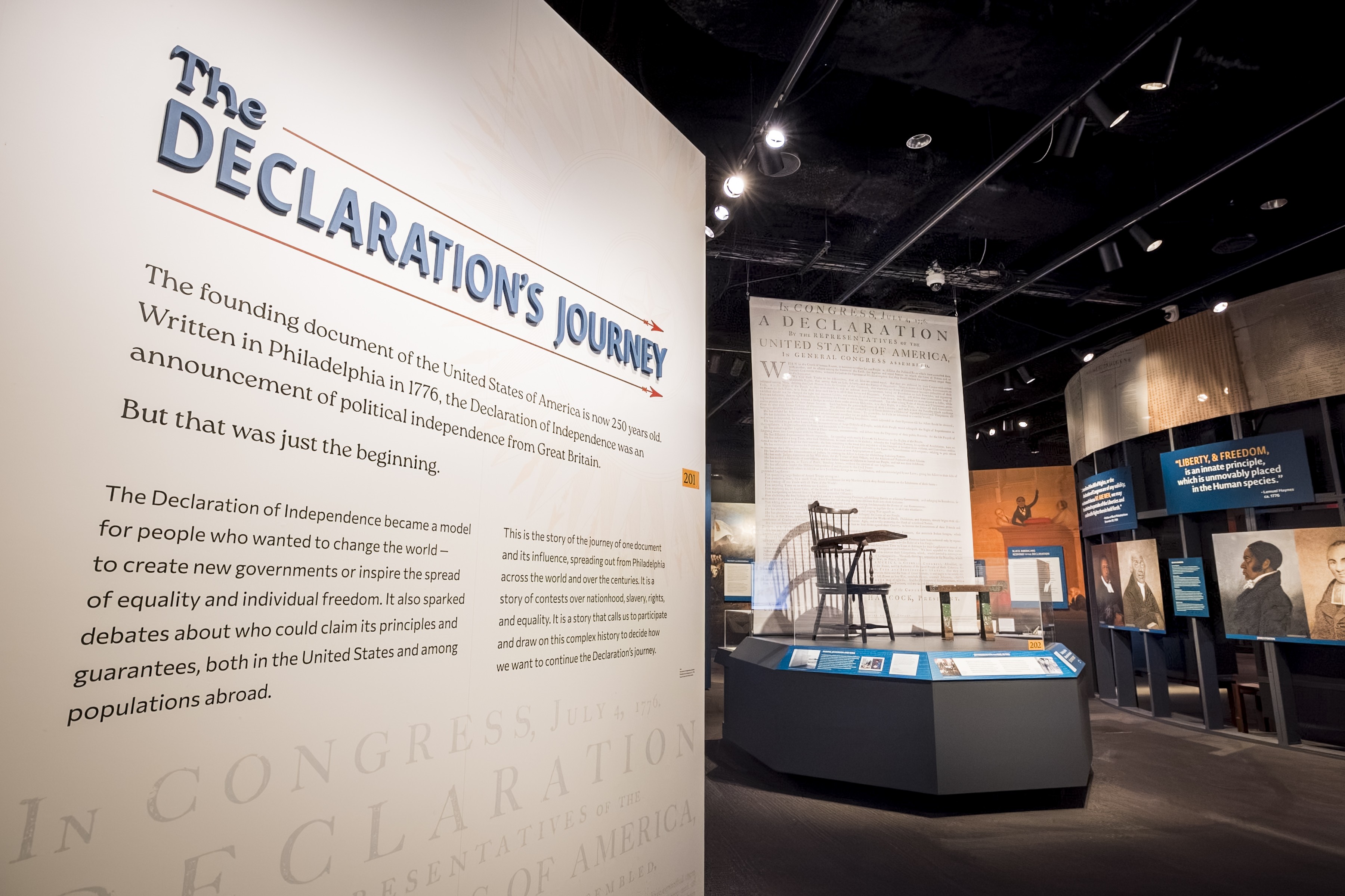 In addition to NEH grants to support the planning and implementation of The Declaration's Journey, a $2.2 million cooperative agreement between NEH and the Museum of the American Revolution is supporting public programs and educational resources to extend the exhibition's reach. These include a scholarly exhibition catalog and podcast series about the influence of the American Declaration of Independence on other international rights documents and movements, a public conference on the 250-year impact of the Declaration on international history, and an interactive digital resource that provides the history and context of passages of the Declaration and their connection to 450 other declarations of sovereignty and equality made across the globe since 1776.